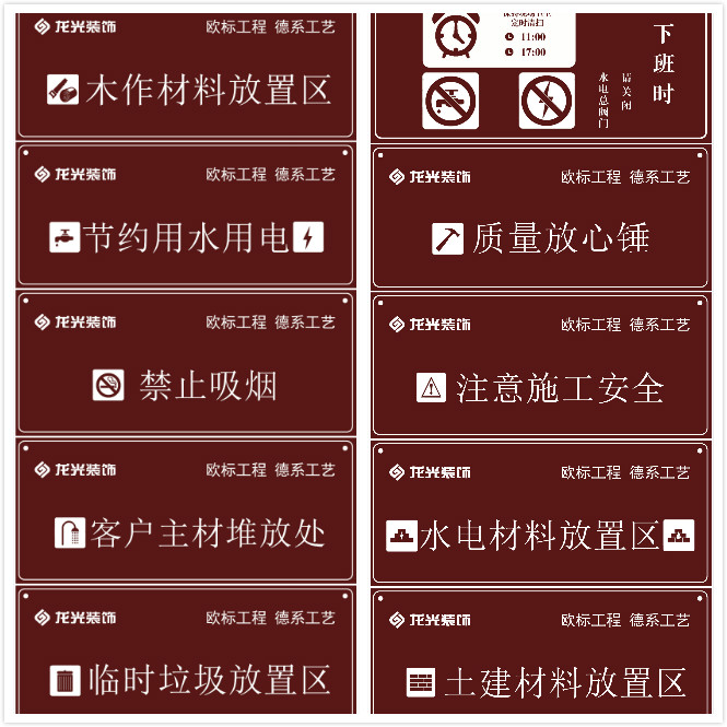 據研究表明,工作環境能夠影響人的工作情緒,而工作情緒又會影響工作質量。為此,歐標生態工程專家根據人的視覺特征,研發并創建了一個生態型施工環境,采用環保材料、開門施工、施工區和生活區嚴格區分、整齊碼放材料、制作適合人體特征的勞動工具、還根據人體的視覺特征來規劃施工現場的施工銘牌、現場警告和溫馨提示,時時警醒、嚴格律己。