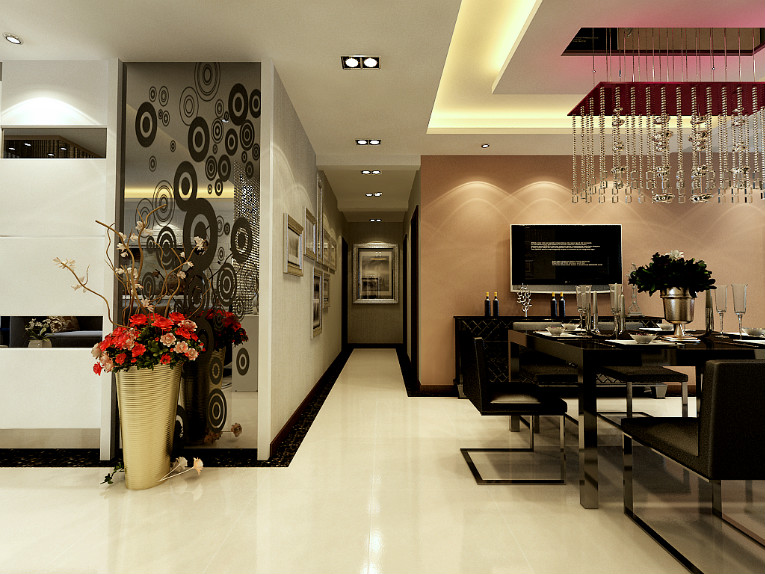 餐廳空間的硬裝上,為了體現業主追求現代主義的個人風格,餐廳的色彩運用比較低調。米黃的豎紋壁紙,黑色的餐邊柜,黑色金屬質感的餐桌和餐椅,華麗時尚的水晶吊燈與餐桌上的器皿呼應。這種色彩組合的呼應能使空間的色彩搭配更具有統一性。