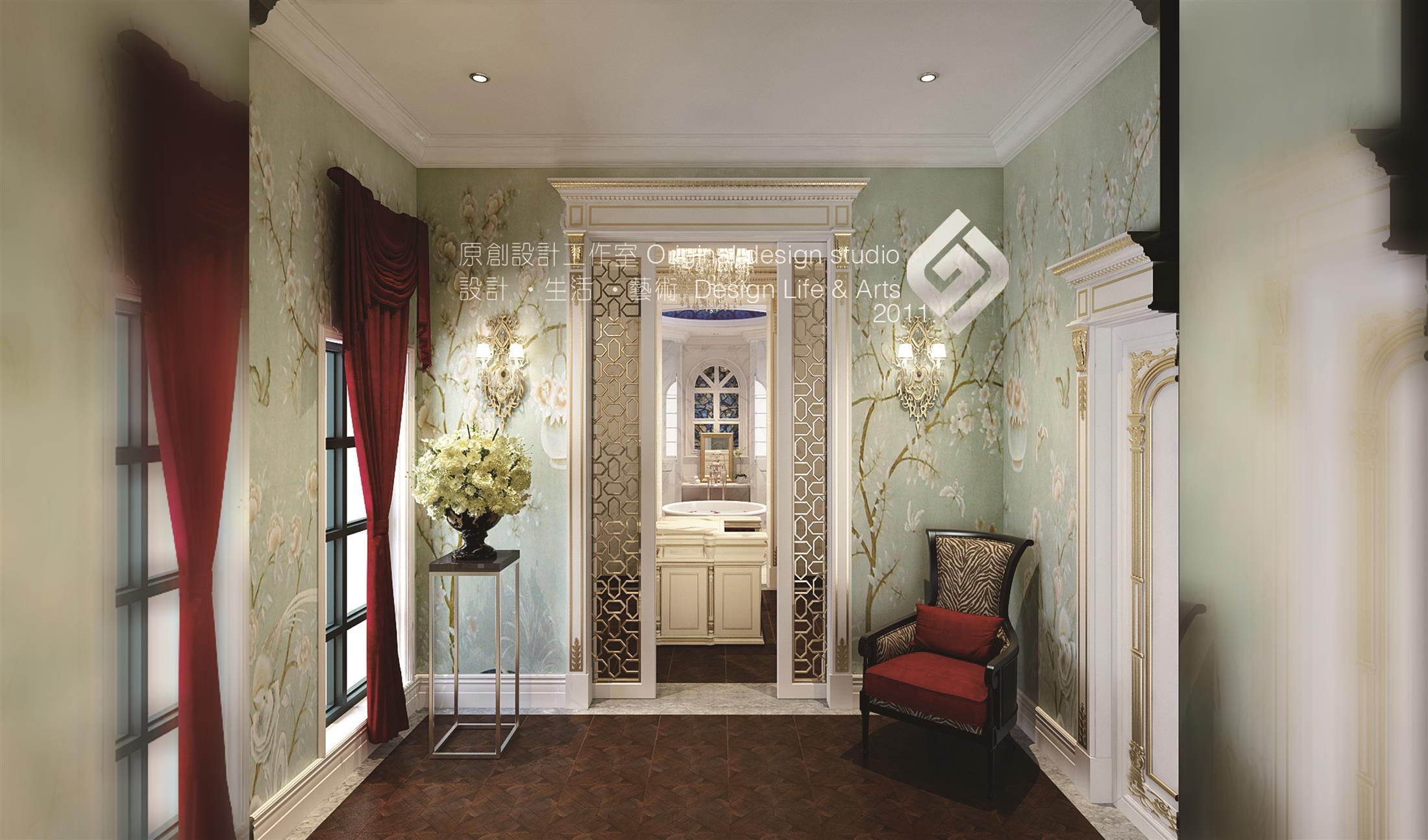墻面以淺色木作墻板為主,搭配墻紙,營造出一種溫馨又華麗的感覺,地面顏色稍深,配合淺色家具和留金飾品及燈具進一步彰顯貴族風范。