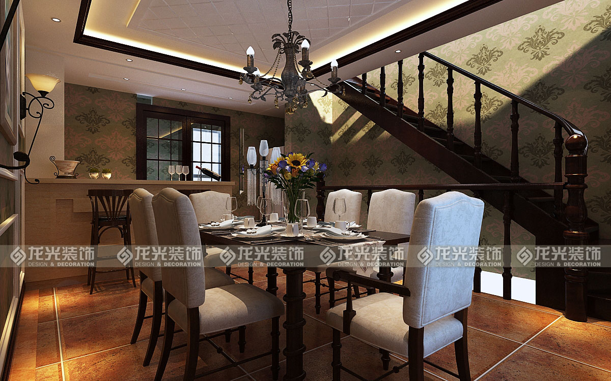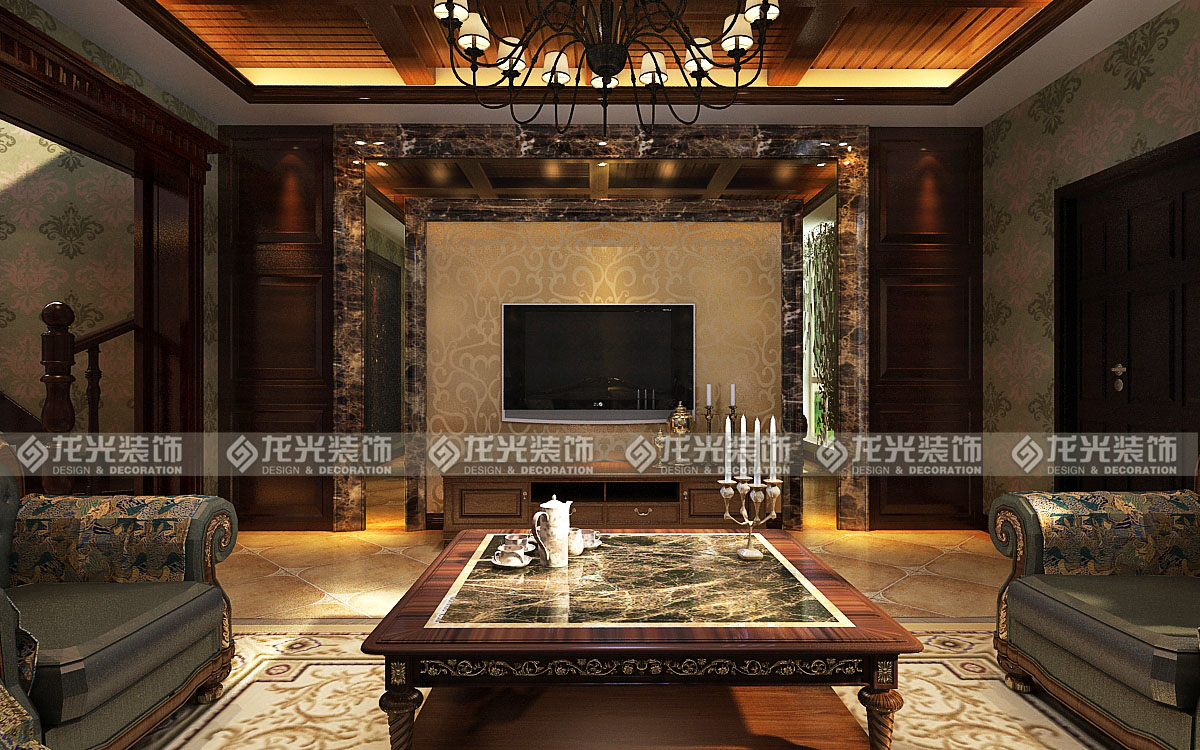 1客廳區(qū)域,色彩豐富,背景墻以墻板理石造型為基礎(chǔ),也是本案一大突出是亮點,使人進門后有種回歸自然的感覺,淡米色的壁紙墻面會使人感覺到幸福、陽光、快樂,客廳中心的拼花式地磚會有一種視覺的沖擊感,客廳銅質(zhì)吊燈更加體現(xiàn)出復古的韻味,吊頂材質(zhì)區(qū)別于以往的石膏吊頂,本案例客廳吊頂采用實木拼花式吊頂,木質(zhì)的結(jié)構(gòu)顏色不僅把美式風格的元素體現(xiàn)的淋漓盡致,更加把吊頂和背景墻的木質(zhì)元素相得益彰。