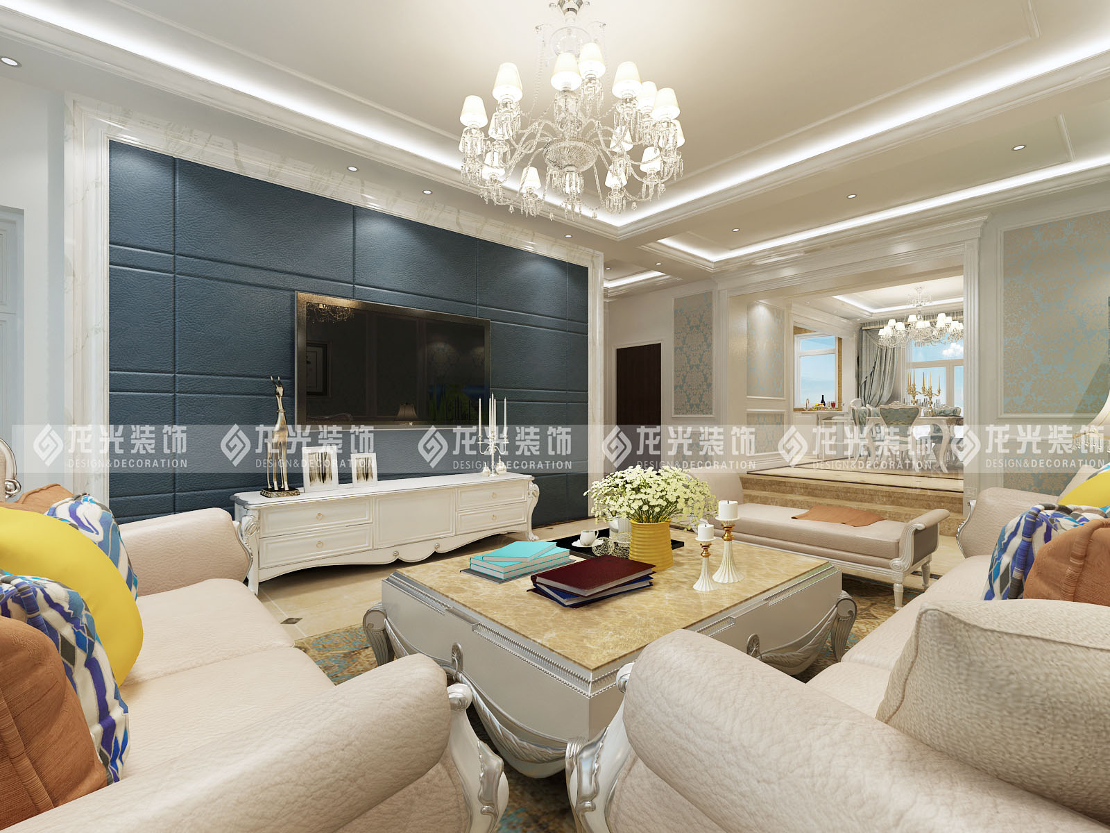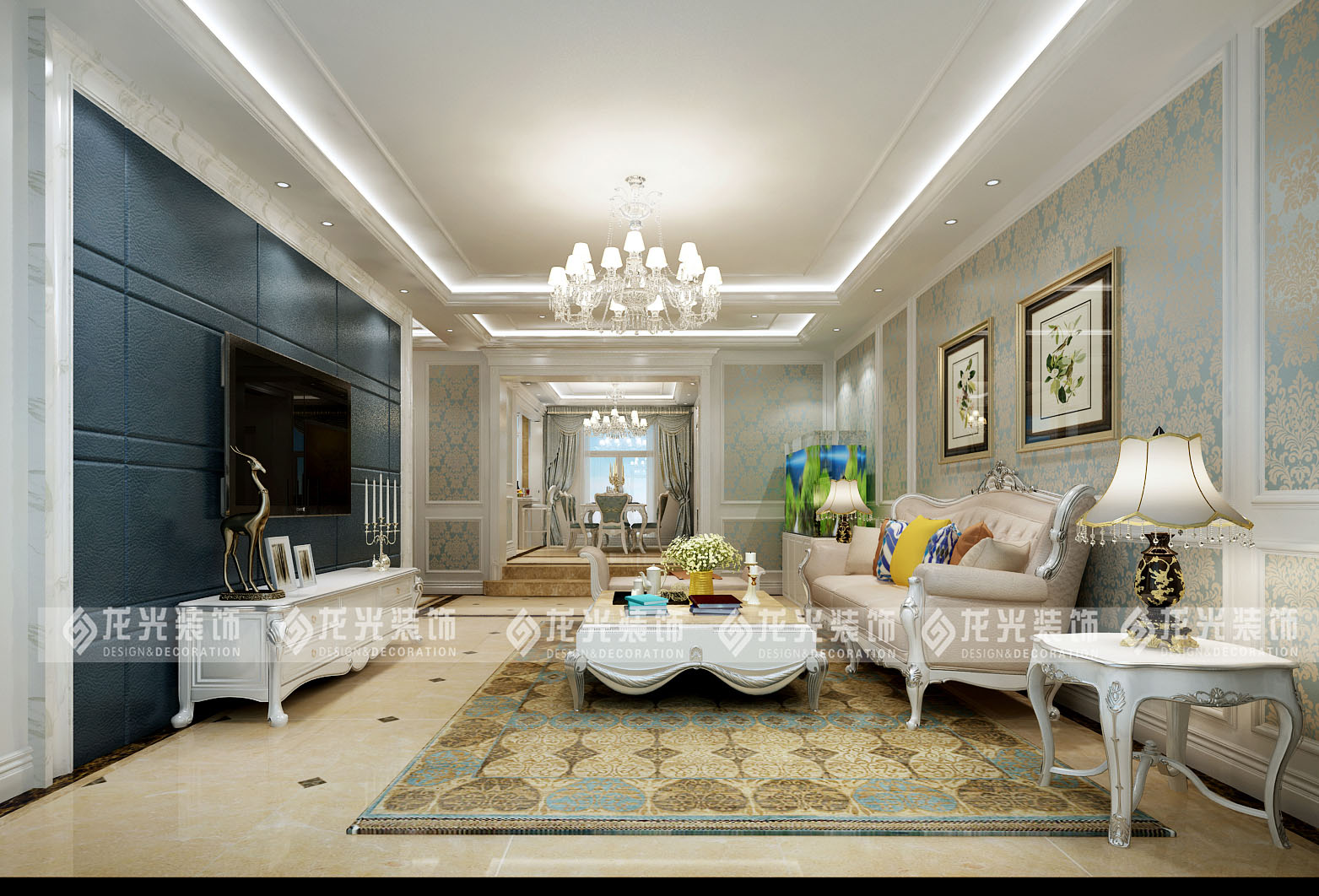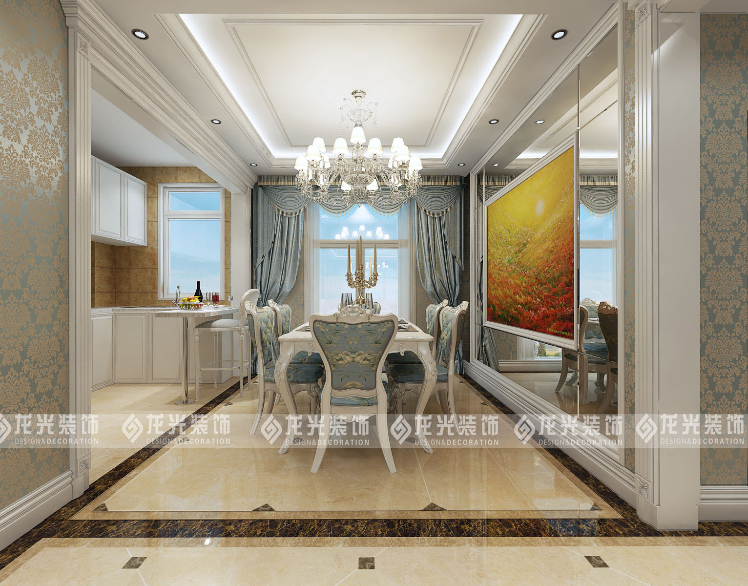 設計理念:本案的業主是一個個體經營者,性格開朗、活潑,根據業主的喜好設計師為其營造典雅、自然、擁有高貴的氣質的簡歐風格,大氣奢華,高雅和諧,浪漫且不失舒適。餐廳與客廳相連,淺藍的壁紙與客廳形成色彩的對比,餐廳加上鏡面的邊框設計,顯得精致純凈,電視墻大理石的淺色線框顯得大氣而高貴,餐桌上自由散開的花藝、高低錯落的裝飾品,營造出了溫馨優雅,富有層次感的就餐空間。歐式風格線角變化豐富,家具及燈飾都略顯歐式特色并有一定的文化氛圍。現代歐式的居室有的不只是豪華大氣,更多的是愜意和浪漫。通過完善的溝通,精益求精的細節處理,帶給家人不盡的舒服觸感,實際上和諧是歐式風格的最高境界。與此同時,本案配搭了暖色的燈光,打破了傳統布局沉悶的格調,使得空間的層次感、穿透性大大增強。后期軟裝方面,選用的配搭燈具、家具等也很考究,既有西式元素,又具有強烈的時代感元素。例如天花水晶燈的閃爍效果,配搭上歐式家具、水晶燈、壁燈、掛畫、飾品等完美組合,形成極具品位的裝飾效果,將奢華的歐式風情演繹得淋漓盡致。