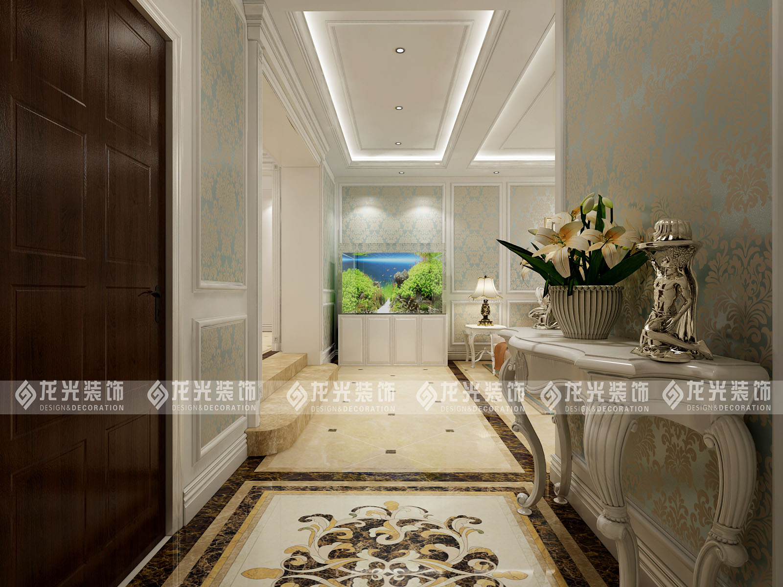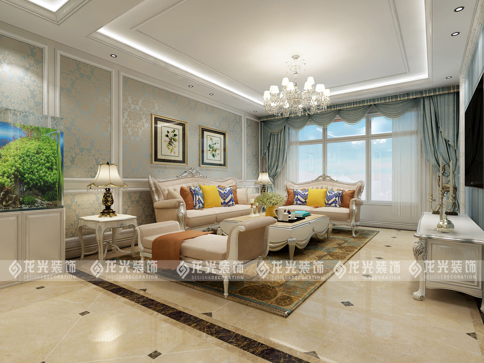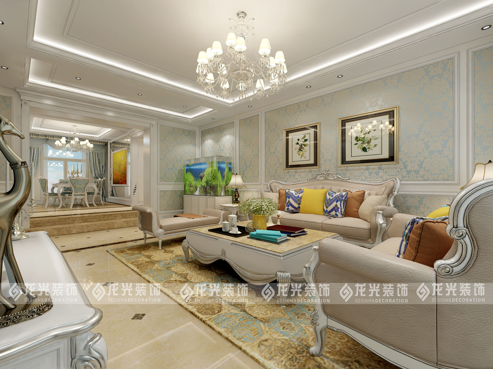 設計理念:本案的業主是一個個體經營者,性格開朗、活潑,根據業主的喜好設計師為其營造典雅、自然、擁有高貴的氣質的簡歐風格,大氣奢華,高雅和諧,浪漫且不失舒適。餐廳與客廳相連,淺藍的壁紙與客廳形成色彩的對比,餐廳加上鏡面的邊框設計,顯得精致純凈,電視墻大理石的淺色線框顯得大氣而高貴,餐桌上自由散開的花藝、高低錯落的裝飾品,營造出了溫馨優雅,富有層次感的就餐空間。歐式風格線角變化豐富,家具及燈飾都略顯歐式特色并有一定的文化氛圍。現代歐式的居室有的不只是豪華大氣,更多的是愜意和浪漫。通過完善的溝通,精益求精的細節處理,帶給家人不盡的舒服觸感,實際上和諧是歐式風格的最高境界。與此同時,本案配搭了暖色的燈光,打破了傳統布局沉悶的格調,使得空間的層次感、穿透性大大增強。后期軟裝方面,選用的配搭燈具、家具等也很考究,既有西式元素,又具有強烈的時代感元素。例如天花水晶燈的閃爍效果,配搭上歐式家具、水晶燈、壁燈、掛畫、飾品等完美組合,形成極具品位的裝飾效果,將奢華的歐式風情演繹得淋漓盡致。