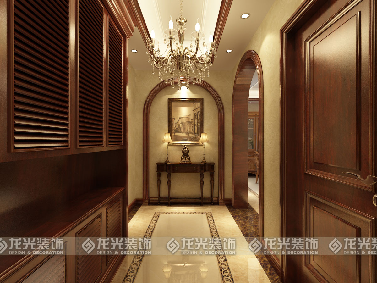 1進門采用玄關式設計,用頂面造型和地面造型增加過廊的體量感,進戶門左面的鞋衣柜更為實用,在柜體中間還可以擺放手機鑰匙等。