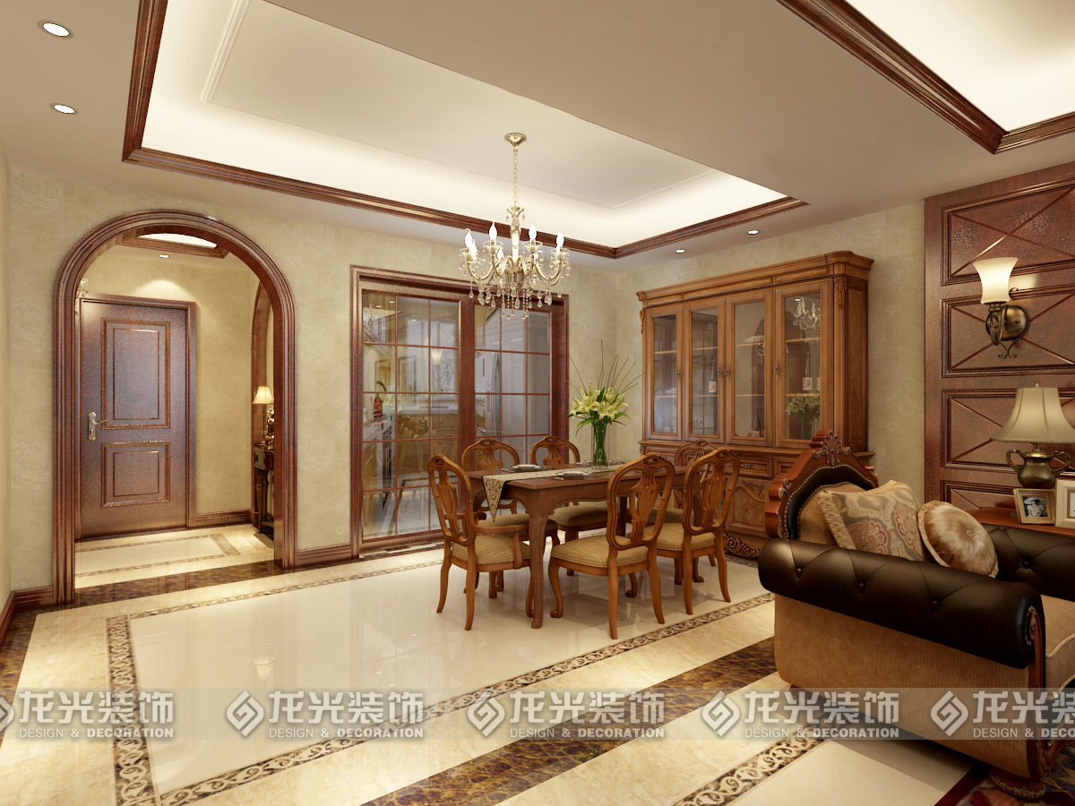 4餐廳區域地面地線和吊頂的木線是相呼應的,從地面和頂面劃分出餐廳與客廳之間的分區。