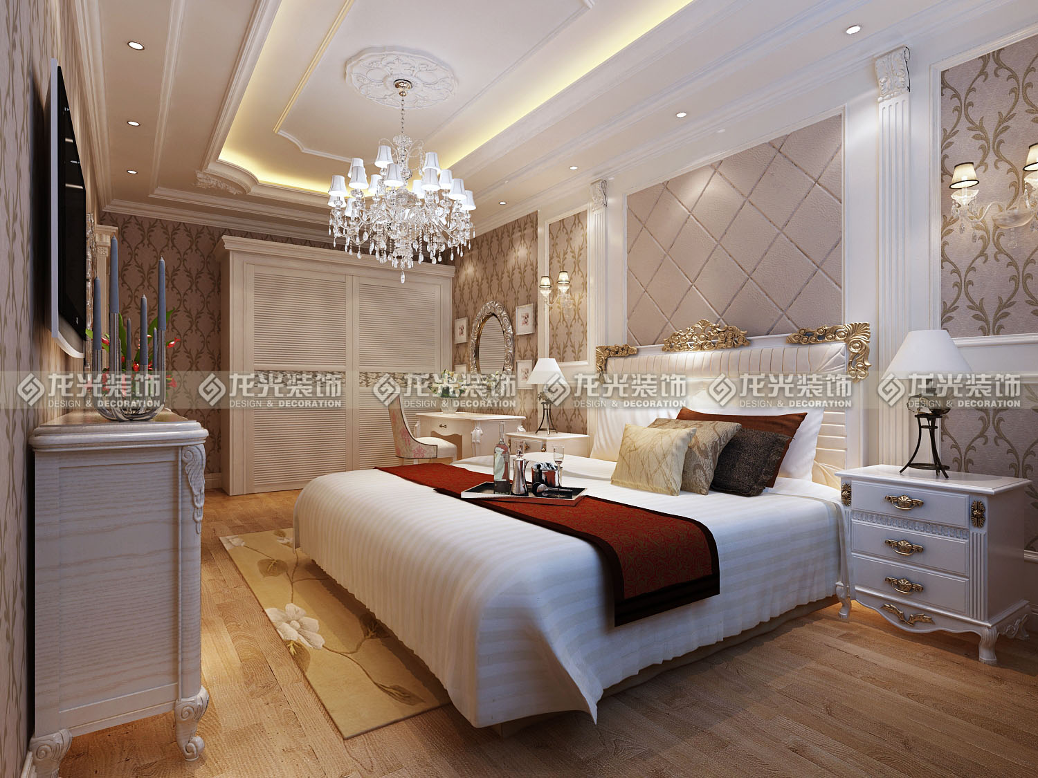 4、主臥室吊頂采用多重疊級(jí)式吊頂,多層大小不同的石膏線體現(xiàn)了歐式元素,使比較大的棚面變得更加精致,細(xì)膩,床頭背景是用護(hù)墻板,壁紙和軟包材質(zhì)相結(jié)合,使得背景墻做出來(lái)更加顯得大氣美觀。